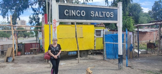El viaje era interminable y no estaban mis hermanos para entretenerme. Una pequeña odisea que terminó en plena noche. Terrible: llegar de noche a un lugar desconocido y dónde se demoraron en venir a recogernos. Mamá me hizo reconocer las letras del nombre del pueblo: Cinco Saltos, y me entretuvo leyendo ese cartel hasta que un señor nos avisó que era el encargado de llevarnos a la chacra.